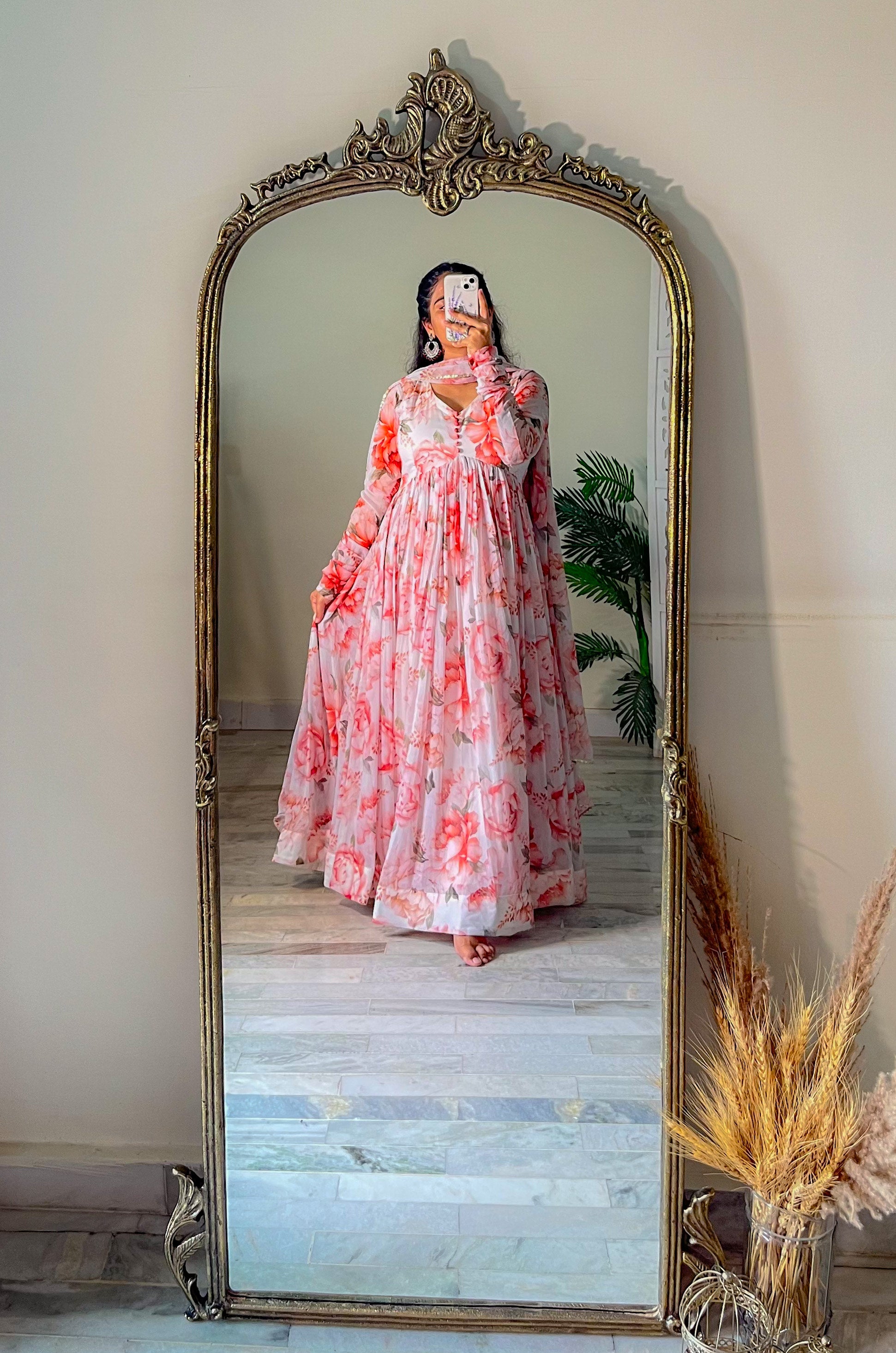 Elevate your festive and wedding season with our new White Floral Anarkali Set. Embrace the spirit of celebrations in this exquisite ensemble, perfect for creating unforgettable moments. Shine with elegance and charm in this must-have outfit.